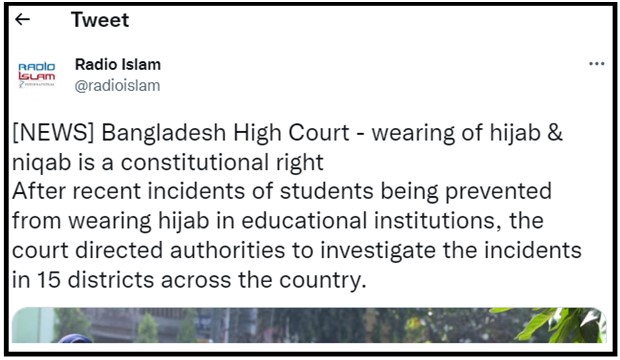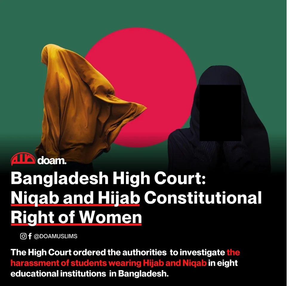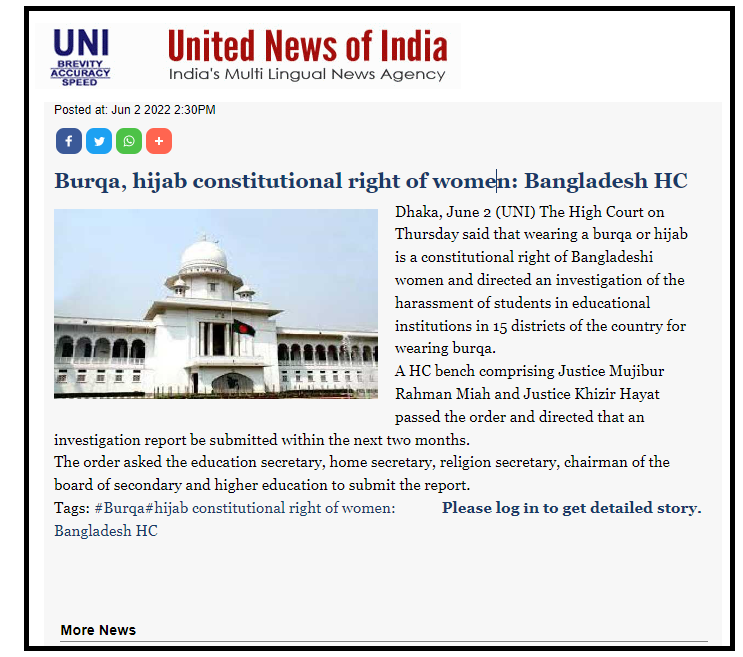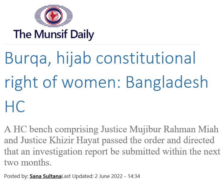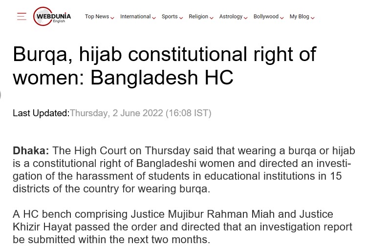 বোরখা বা হিজাব পরা সাংবিধানিক অধিকার বলে জানিয়েছেন উচ্চ আদালত। সারাদেশের বিভিন্ন জেলায় ১৫টি শিক্ষাপ্রতিষ্ঠানে শিক্ষার্থীরা বোরখা বা হিজাব পরায় হেনস্থার শিকার হওয়ার ঘটনায় তদন্ত করার নির্দেশও দিয়েছেন হাইকোর্ট।